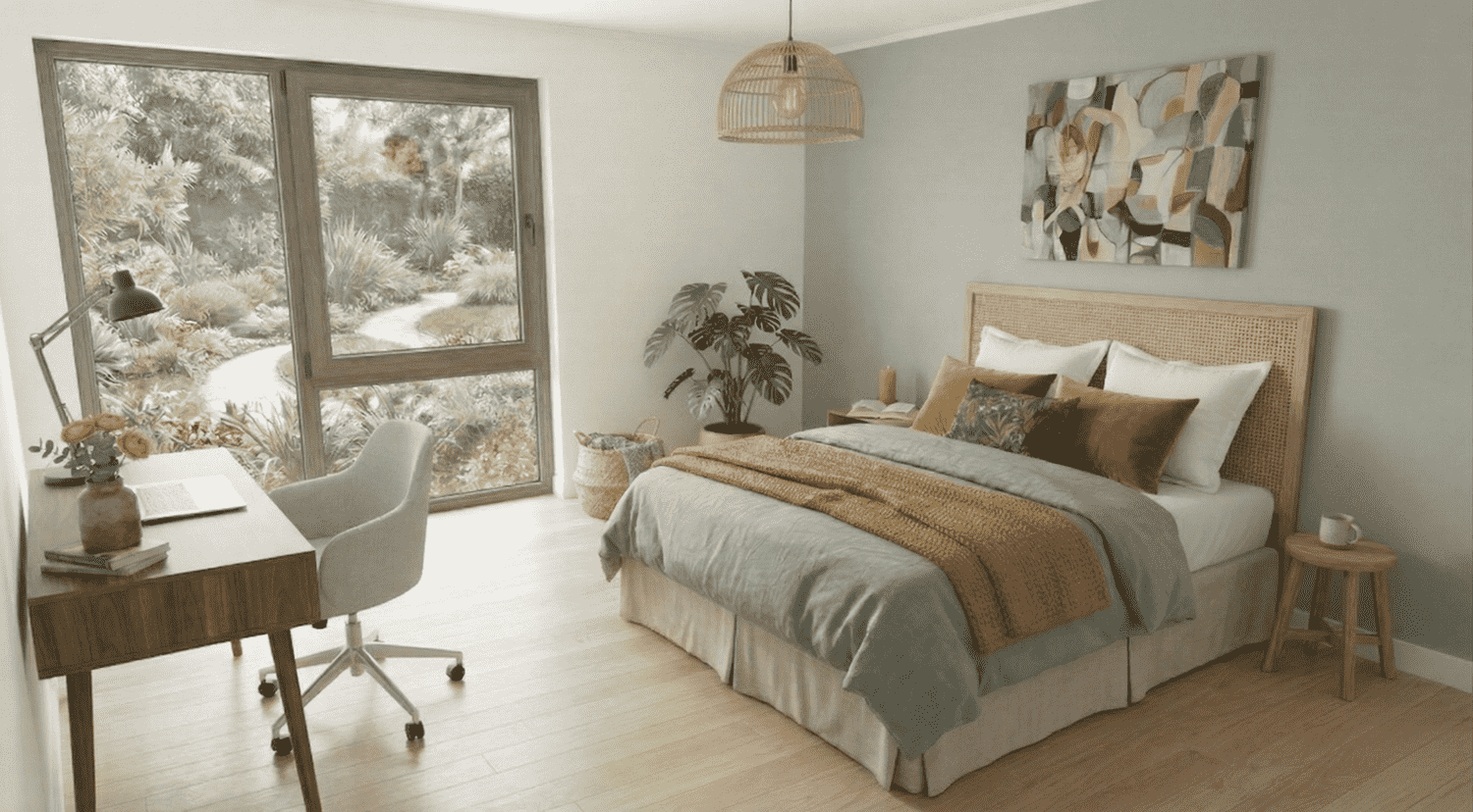 Forja tu zona de teletrabajo en un dormitorio inmenso y lleno de luz. Sus robustos ventanales de madera laminada frenan el clima y eliminan cualquier ruido exterior. Disfruta un diseño interior que fusiona la paz de tu jardín con el calor de tu hogar, logrando máxima eficiencia para tu casa.